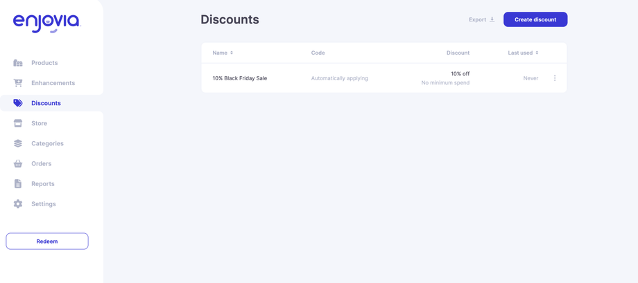 After you have made a discount, the page will display a list of your active and draft discounts.