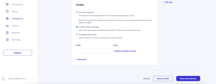 - Create codes manually - Add one or more codes and define the number of times each code may be used. Note: Restricting the number of codes is optional.