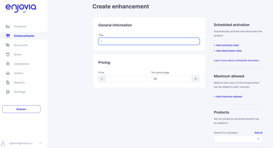 - Products - Set the products the enhancement can be added to, this can also be done in the product page if you have build enhancements before products.