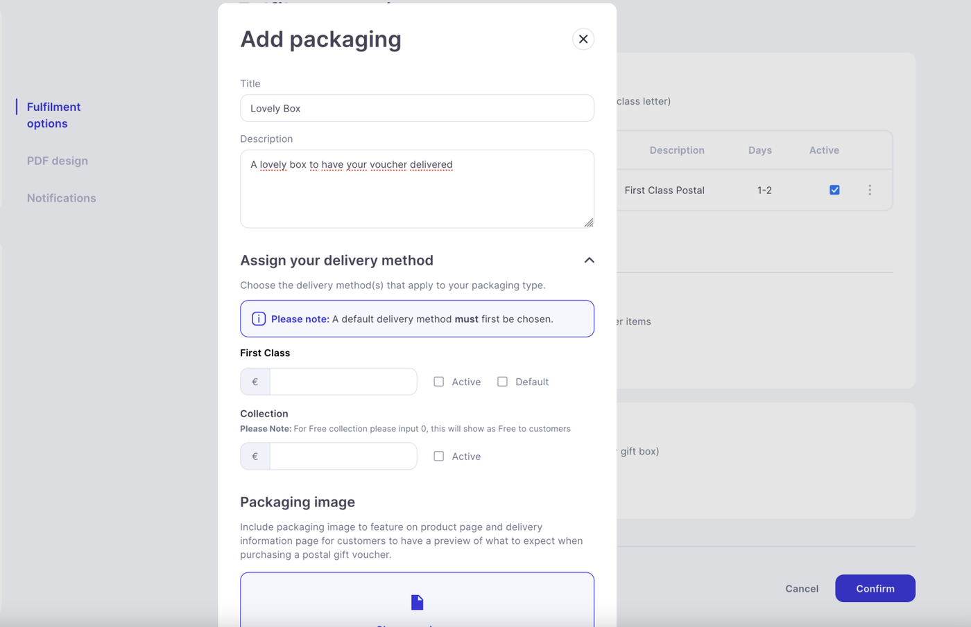 For postal fulfilment, the first thing you will need to set is delivery methods, i.e. first class post, this refers to the method in which the vouchers will arrive to the customer.