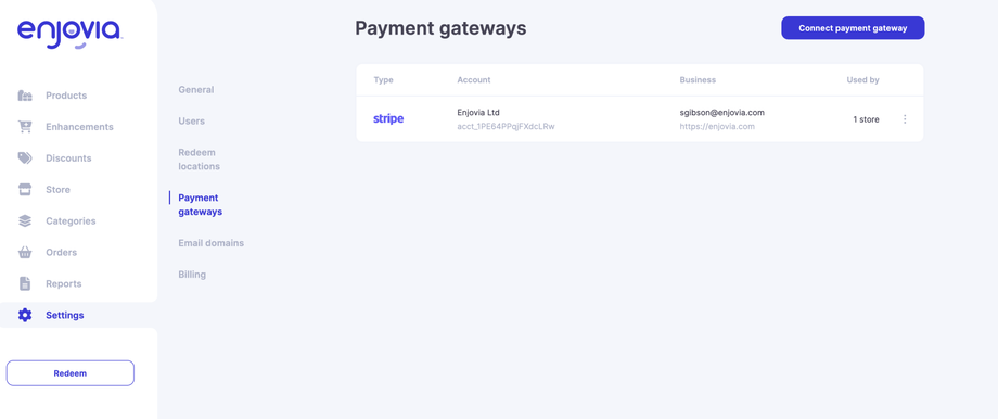 A payment gateway is an e-commerce service that processes credit card payments for you so that you are able to take payments from cards, online. Enjovia do not hold onto your revenue at any point, it goes directly into your stripe account.