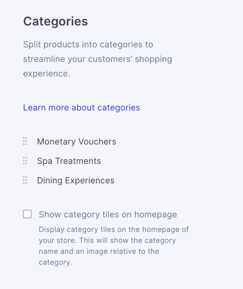 If you wish to split your products into categories our system will also support a category view if you select, show category tiles on homepage.