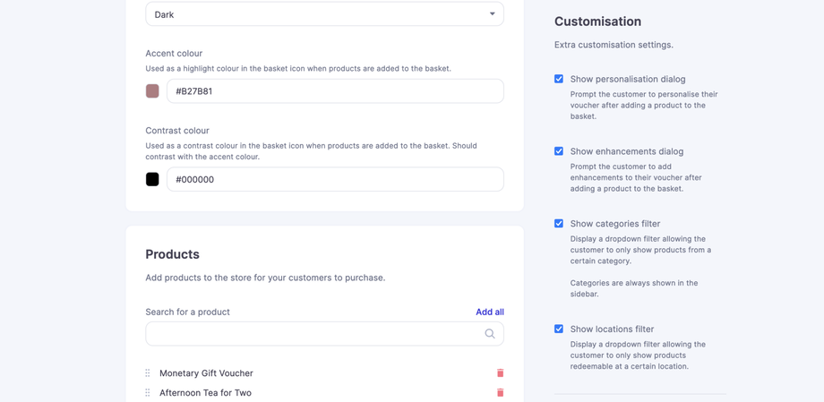 Show enhancements dialog - When products have enhancements, you can select whether you want to additionally prompt the customer to add one after adding a product to their basket.