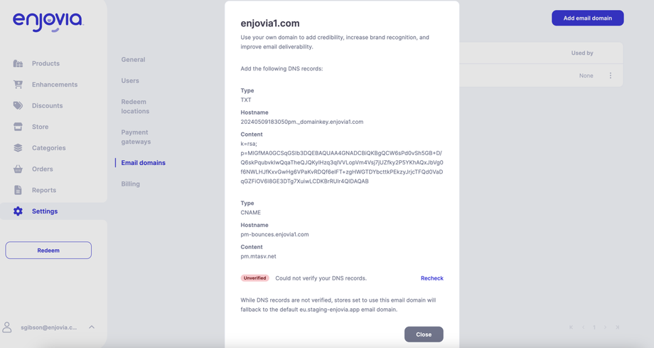 You can check whether the changes have gone through by going back to the main email domain menu and clicking the three dots, this will open a verify window that will create the same popup as before. Press recheck and you will see the red unverified turn to verified.