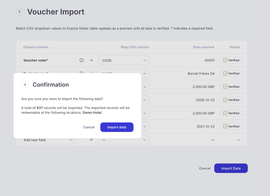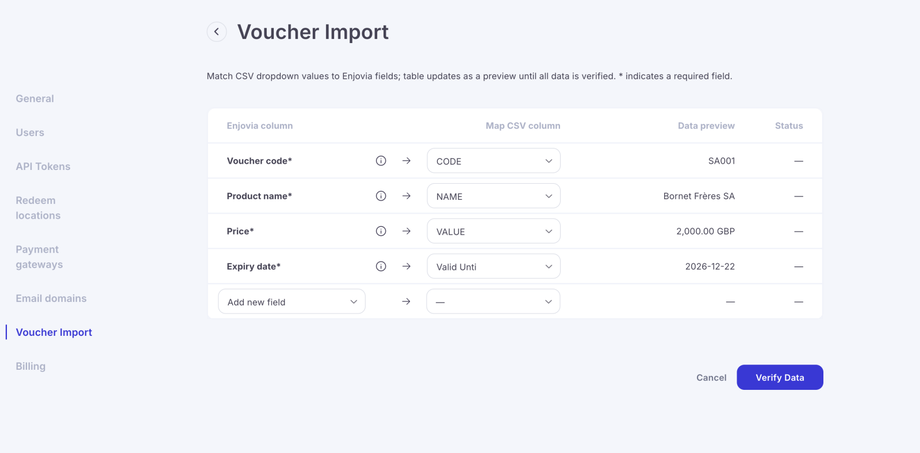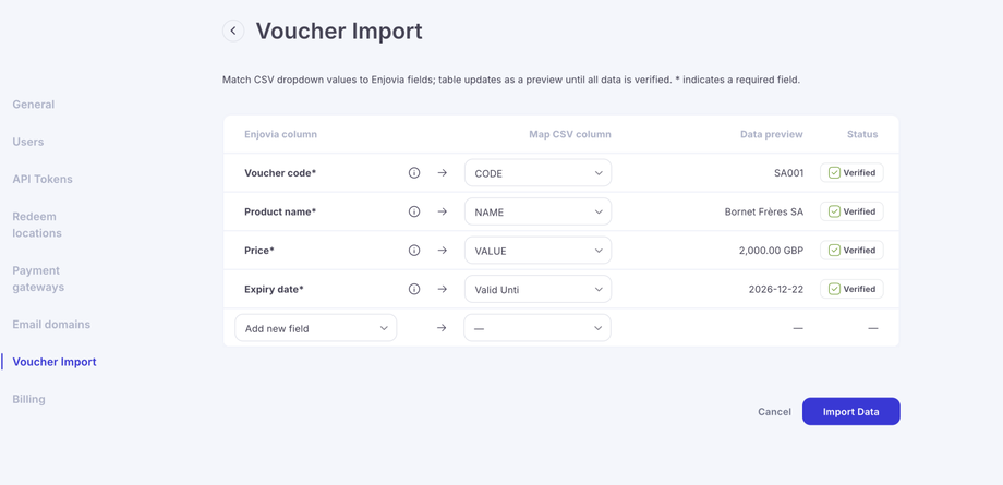 When you upload your CSV, the system will show this field mapping page. This is where you tell the importer which columns in your file match our voucher fields.