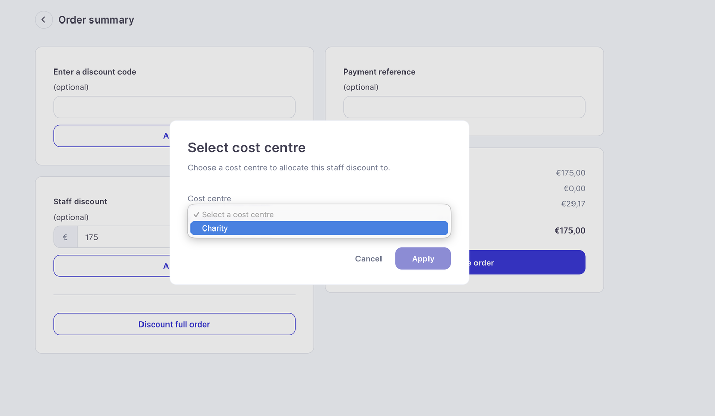 If you have cost centres enabled, you can add a cost centre to any discount put through the terminal (see cost centre article here for more information)